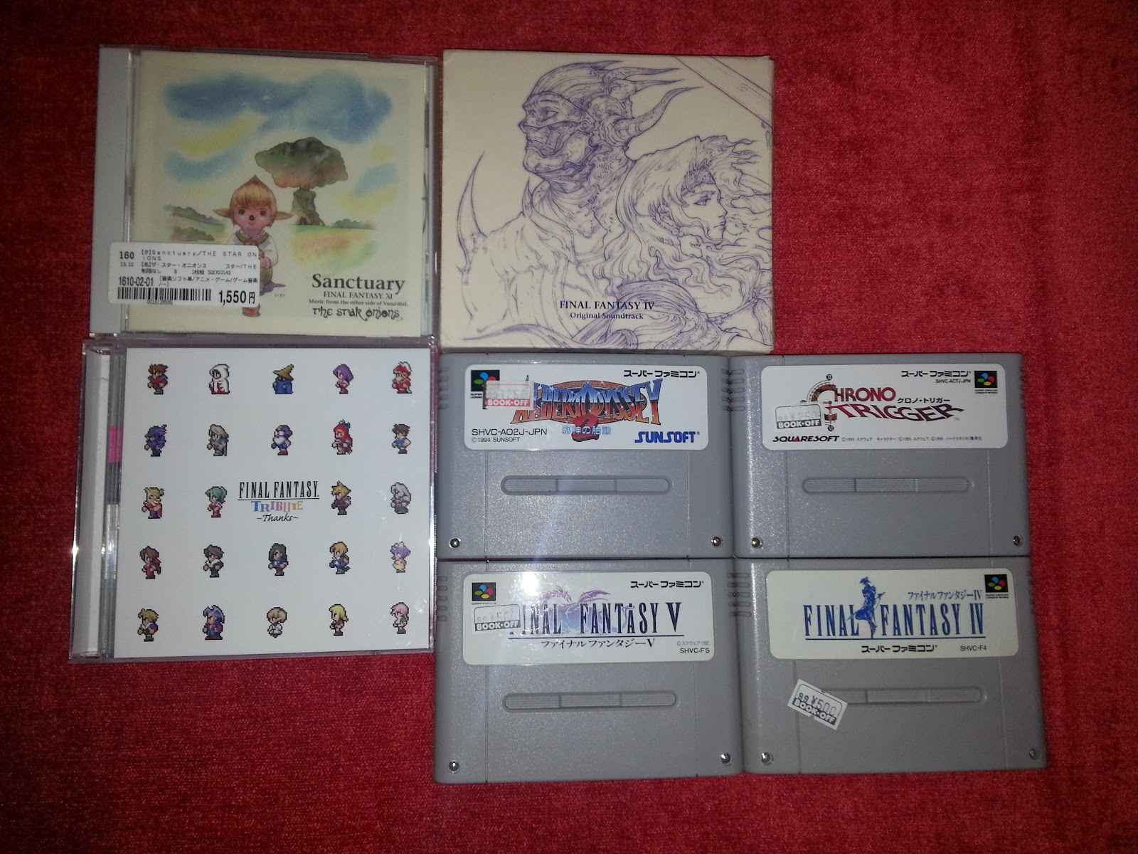 That's 3 Final Fantasy soundtracks I didn't have. I'm a little obsessed with the series and Nobuo Uematsu is one of my favorite composers. The cartridges are Final Fantasy IV, V, Chrono Trigger, and Albert Odyssey for Super Famicom. The Final Fantasy games and Chrono Trigger rank in my top 5 favorite video games, so for the price I figure they're neat collector's items.